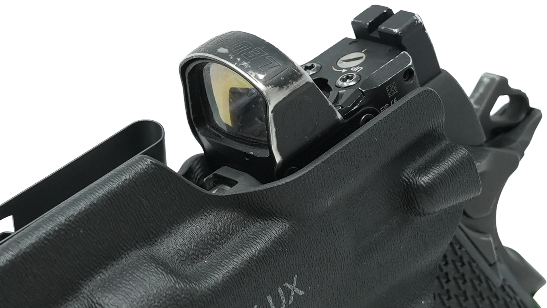 The holster is designed with profiling at the trigger guard and sweat guard ensuring a full and positive grip on the gun. The shirt guard is carefully profiled to eliminate sight bite and to allow for an unencumbered high thumb grip.