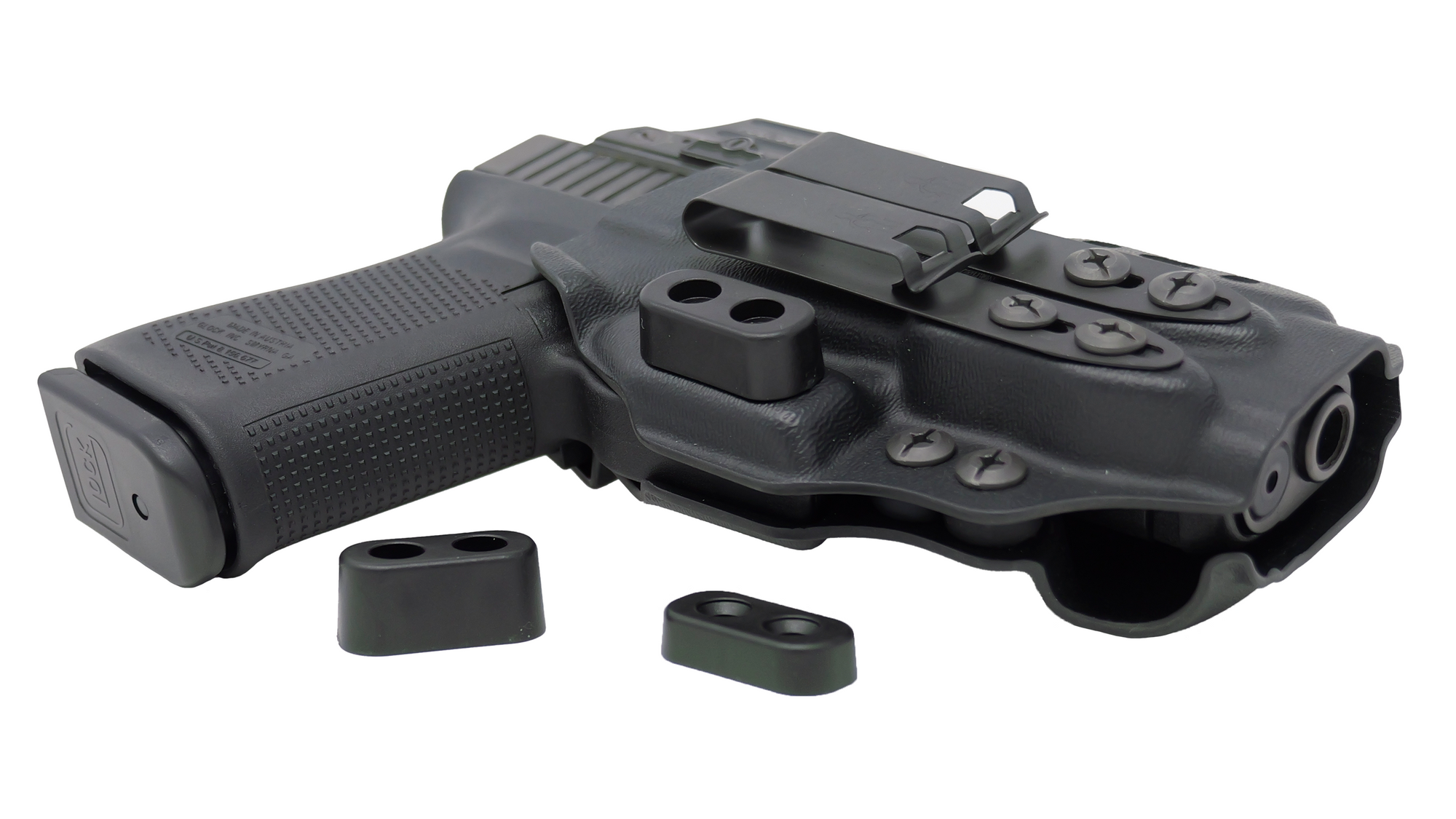 Three heights of camming bars to fine tune the rotation of the holster into the body for optimal concealment. Two positions for camming bar location adjusted for ride height preference.