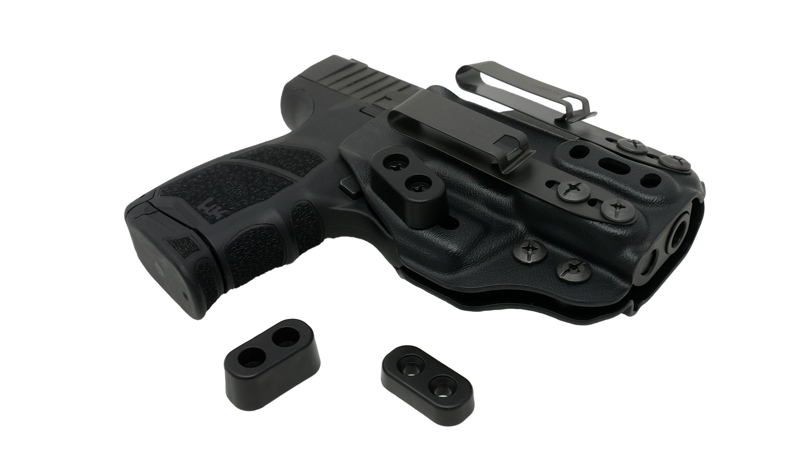 Three heights of camming bars to fine tune the rotation of the holster into the body for optimal concealment. Two positions for camming bar location adjusted for ride height preference.