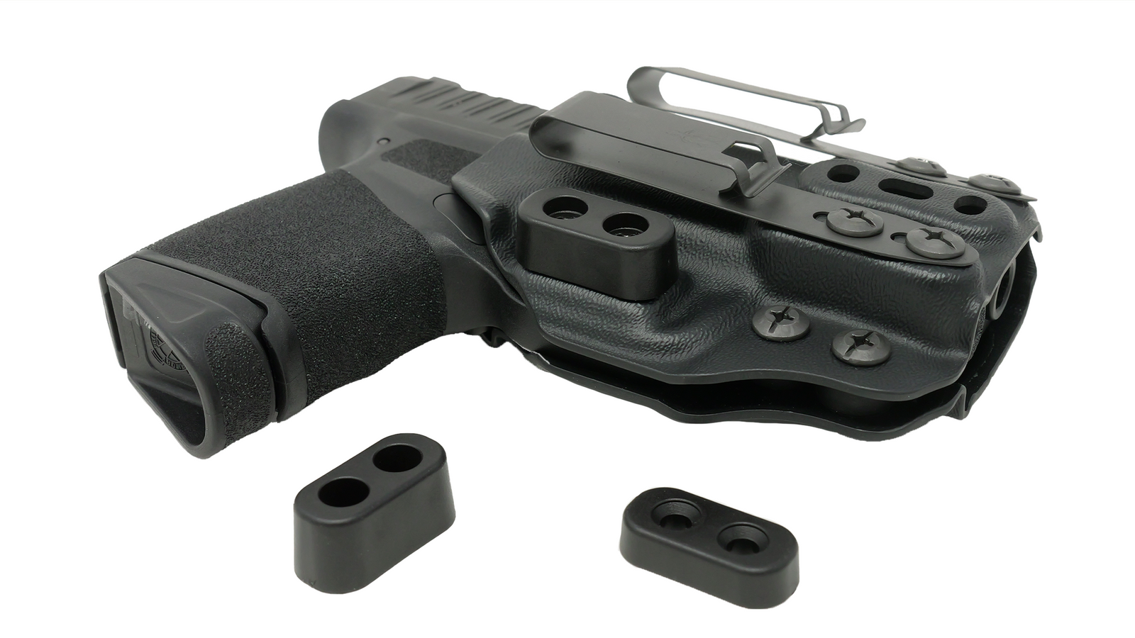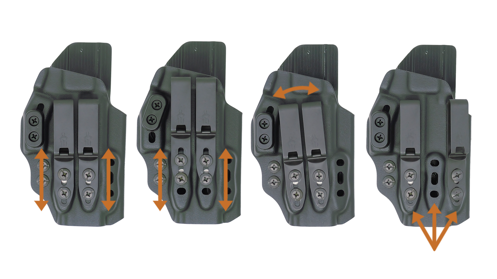 Three heights of camming bars to fine tune the rotation of the holster into the body for optimal concealment. Two positions for camming bar location adjusted for ride height preference.