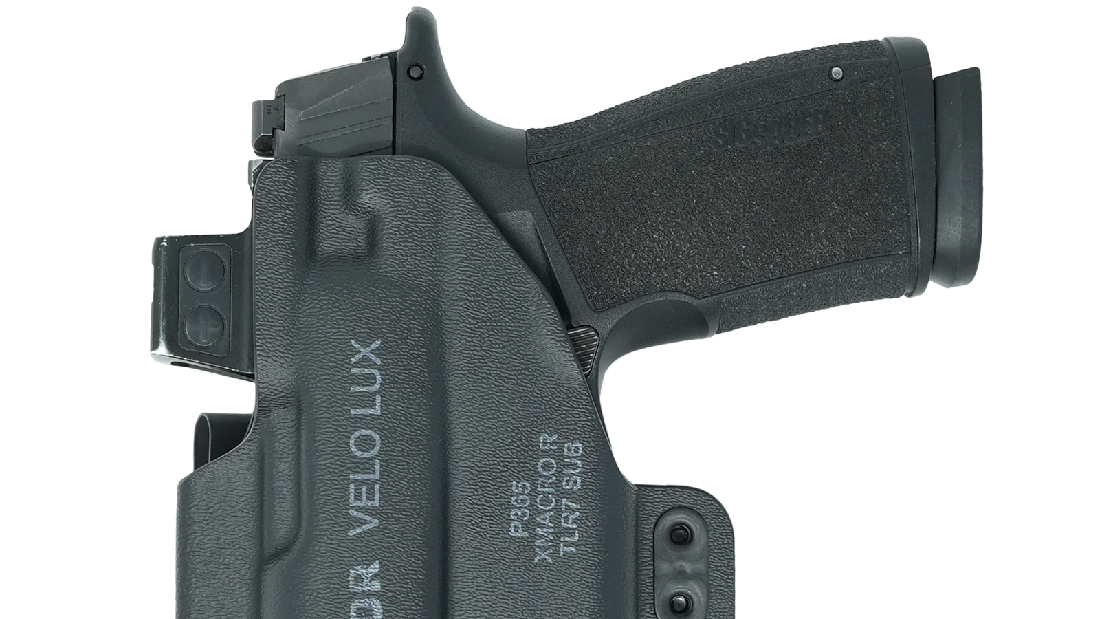 The VELO LUX holster is a purpose-built appendix carry holster for guns with weapon mounted lights. The VELO LUX reduces the gun and light's profile to ensure effortless concealment and all-day comfort.