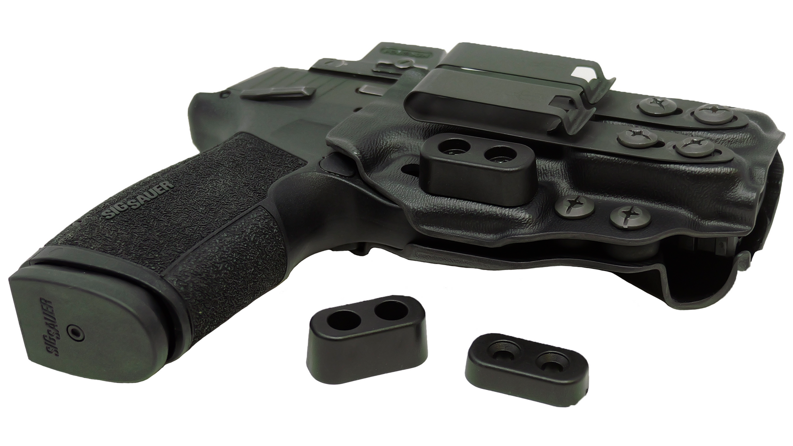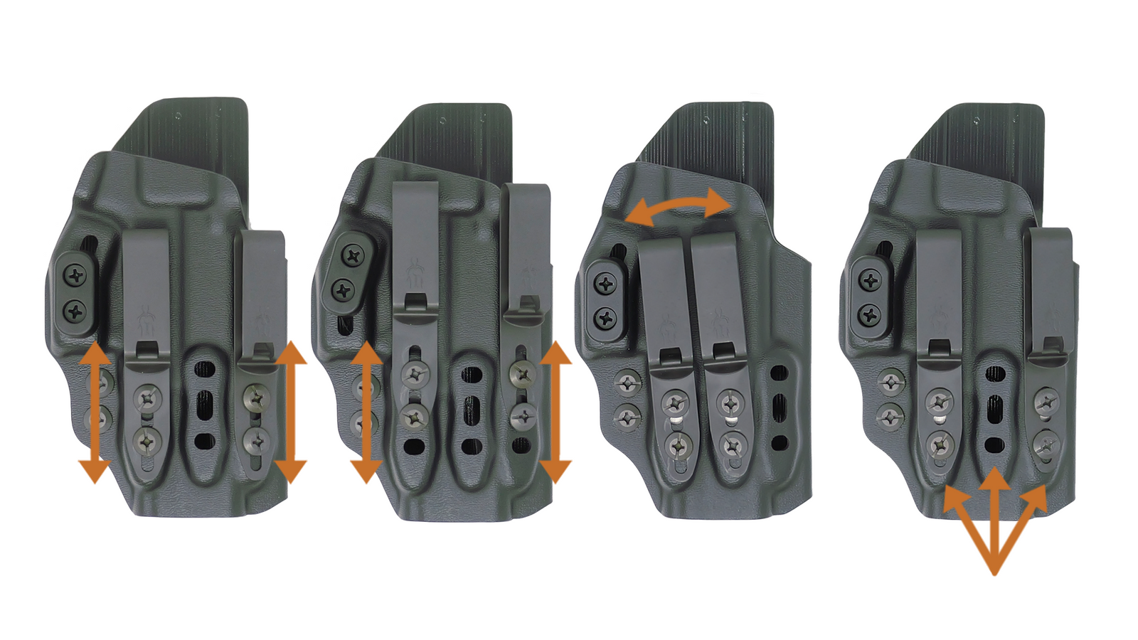 Three heights of camming bars to fine tune the rotation of the holster into the body for optimal concealment. Two positions for camming bar location adjusted for ride height preference.
