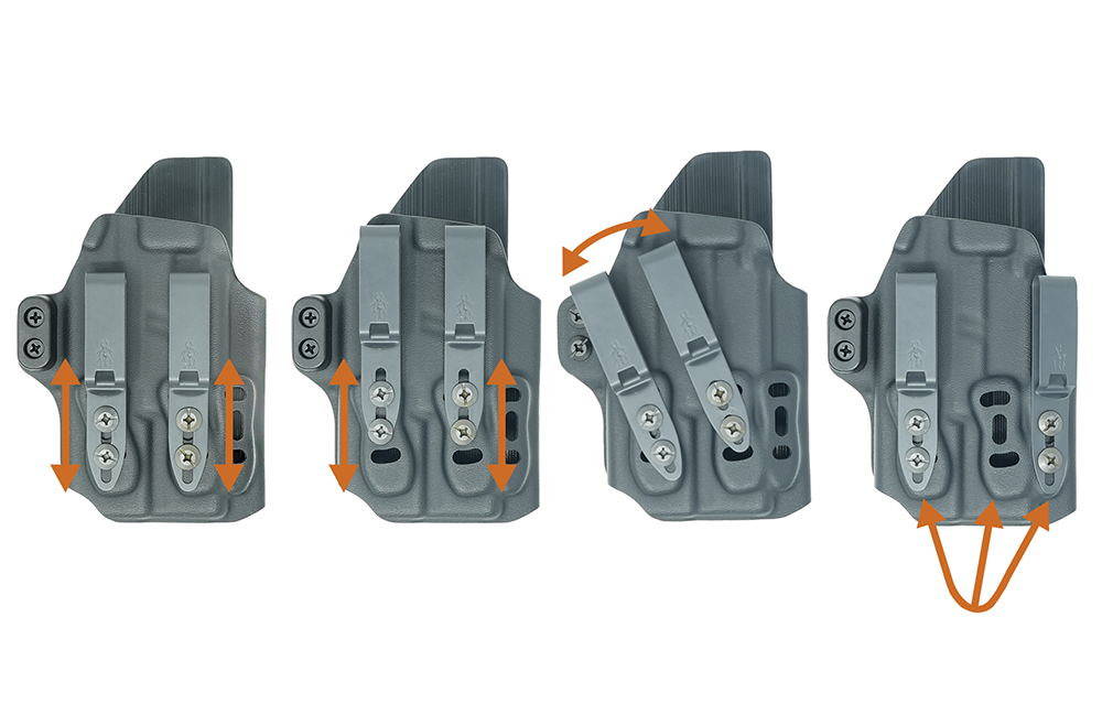 Three heights (low, medium and high) of camming bars to fine tune the rotation of the holster into the body for optimal concealment. Two positions for camming bar location adjusted for ride height preference.